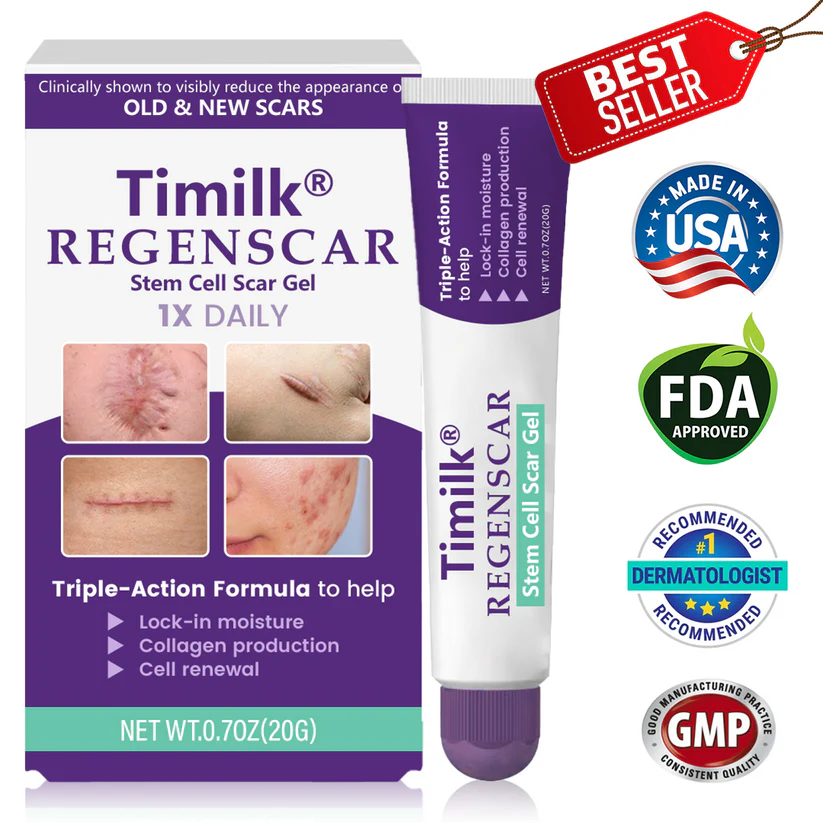 Timilkยฎ ReGenScar Stem Cell Scar Gel, developed in collaboration with board-certified U.S. dermatologists. It delivers professional-grade skincare with every application. Its advanced formula is designed to significantly reduce the appearance of both new and old scars, including surgical scars, stretch marks, keloids, acne scars, burns, warts, skin tags, and varicose veins.