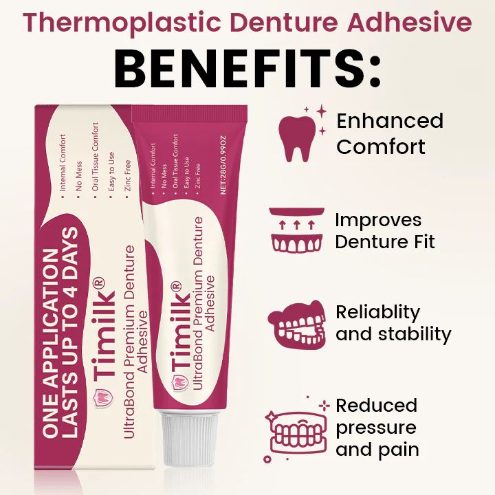 Experience a new standard of denture comfort and confidence with Timilk® UltraBond Premium Denture Adhesive. Powered by advanced ThermoBond heat-activated technology, it forms a personalized, secure seal that adapts perfectly to your gums — providing up to 4 days of slip-free hold. Enjoy every meal, every conversation, and every smile knowing your dentures stay perfectly in place — comfortably and naturally.